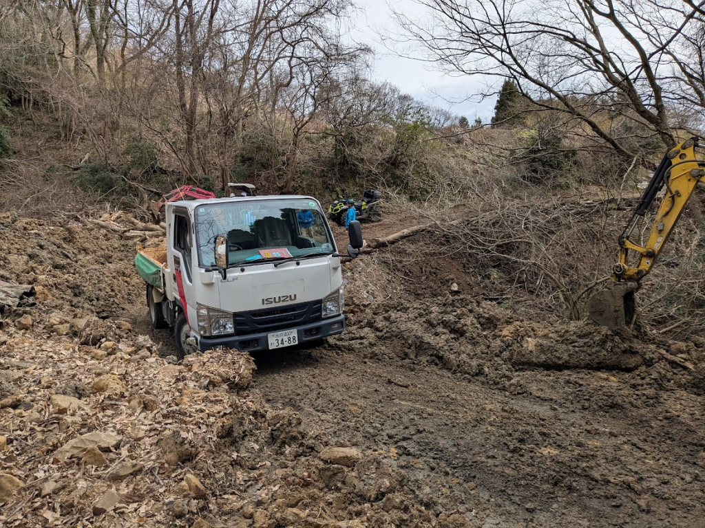 しかし、地域の炭焼き職人さんが2トントラックを使っていると知り、現場で相談を重ねた結果、予定よりも時間をかけて、2トントラックでも余裕をもって通れる幅を確保できた。