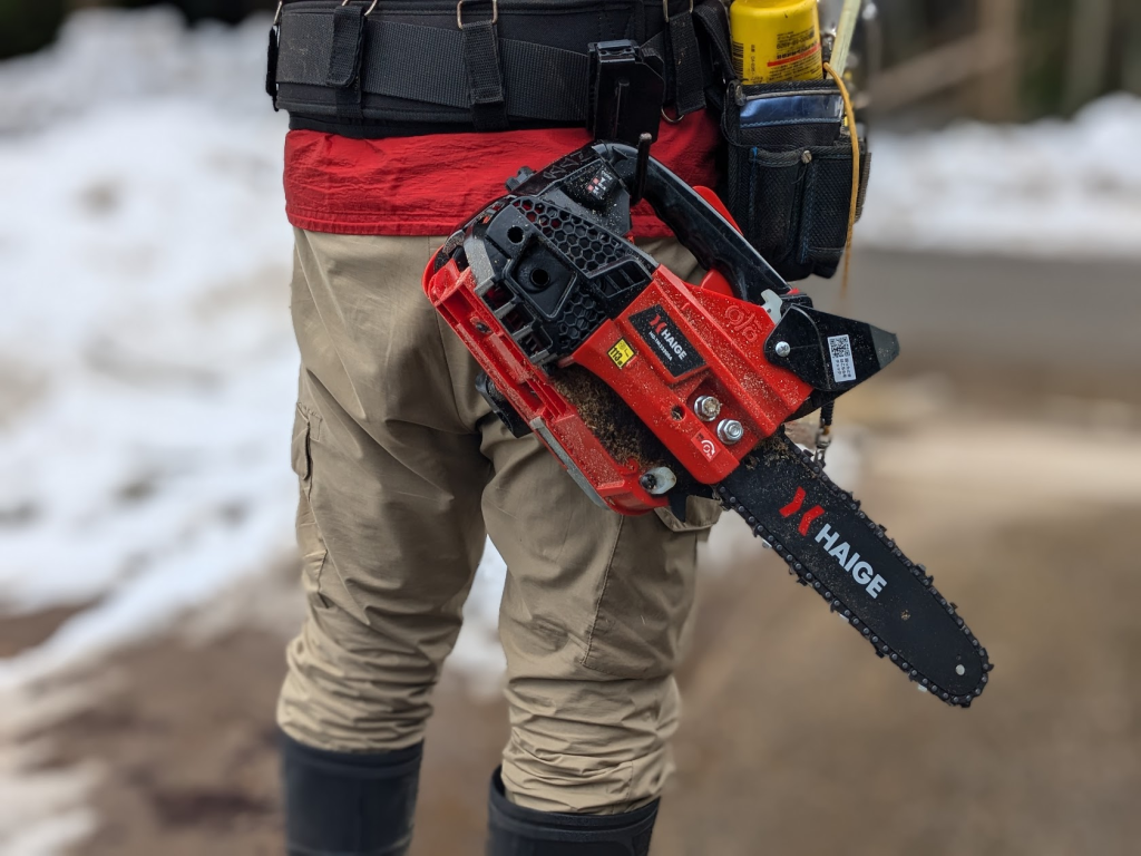 何より嬉しかったのは、腰ベルトに掛けられることだ。タジマのフックにストレスなく脱着できる。梯子や木に登るとき、片手で重いチェーンソーを持つ必要がなくなった。作業中も、隣の木の上に置く必要がない。バランスを崩して地面に落とすこともなくなった。